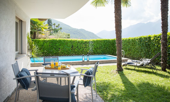 Mit den verschiedenen Sitzmoeglichkeiten im Aussenbereich geniessen Sie eine einmalige Aussicht auf den Lago Maggiore und die umliegenden Berge. Hier wird jeder Moment zum einem Genuss für die Sinne und die gemeinsamen Stunden mit Freunden und Familie zu einem unvergesslichen Erlebnis. Im unteren Gartenbereich ist das Sommerparadies mit Pool und Wiese, die zum Spielen genauso einlädt, wie zum Sonnen, Lesen, Malen oder einfach "dem süssen Nichtstun (der Pool steht grundsätzlich ab Anfang Juni bis Ende September zur Verfügung, da nicht geheizt). Fühlen Sie sich herzlich Willkommen für wunderschöne Ferien im Casa Alexandra am Ostufer des Lago Maggiore.