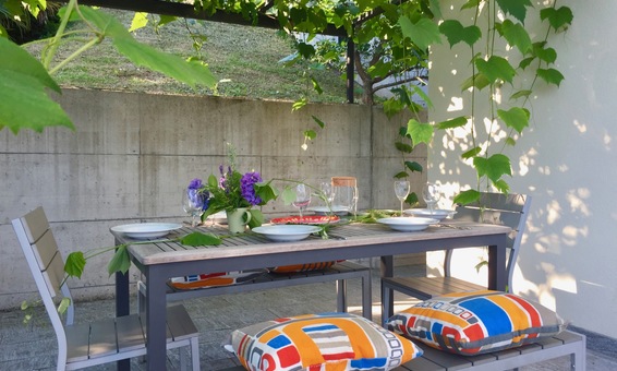 Eine weinberankte Pergola an der Giebelsseite des Hauses bietet Ihnen während der Sommermonate wunderbaren Schatten für die gemeinsamen Mahlzeiten oder entspannte Gespräche.
