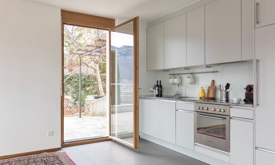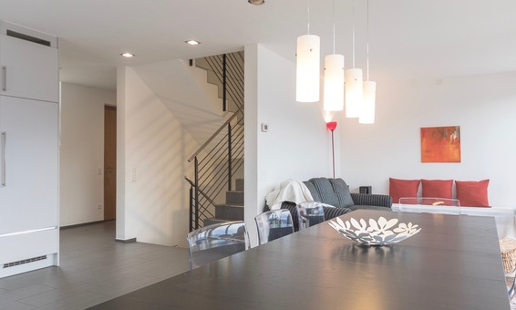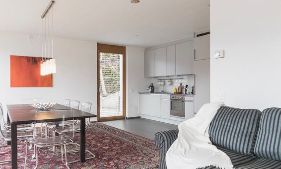 Wohn-Essbereich mit grosser Glasfront (Schiebetüren) und Ausgang auf die Terrasse Offene Küche mit Zugang zur TL-förmigen Terrasse mit Pergola mit Granitgarnitur