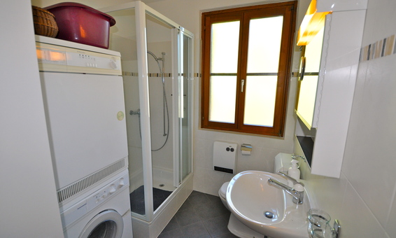 Badezimmer: Bad mit Dusche | Waschbecken | WC | Waschmaschine und Tumbler.