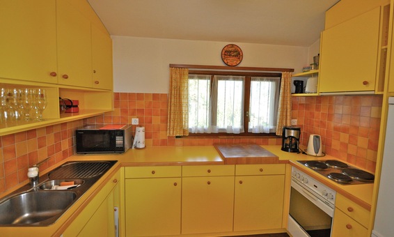 Küche mit Kühlschrank, Gefrierfach, Elektroherd, Backofen, Mikrowelle und Geschirrspüler. Die Küche ist komplett ausgestattet mit allen Utensilien, Geschirr, Gläser etc.