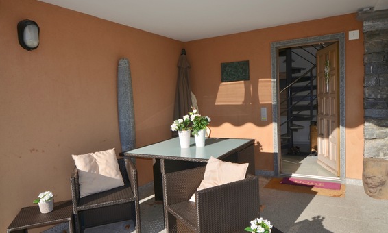 Überdachter Eingangsbereich mit variabelem Sitzplatz, der auch bei Regen oder viel Sonne für gemütliches Beisammensein zu nutzen ist