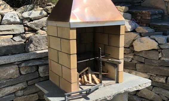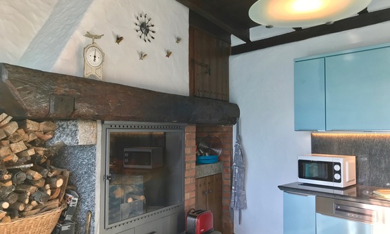 Die Küche mit gemütlichem Kamin ist separat und durch einen offenen Bogen mit dem Wohnbereich verbunden.
