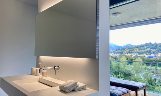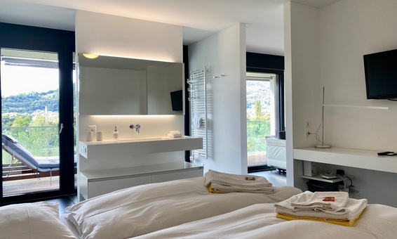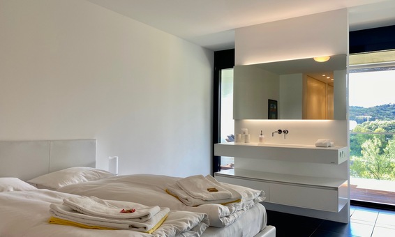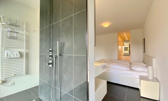 Das Duschbad ist geschickt in den Schlafraum integriert und es wird zu einem wahren Erlebnis hier, mit offenem Blick auf die schöne Natur des Maggia-Flusses in absoluter Privacy zu duschen. Das WC ist separat.