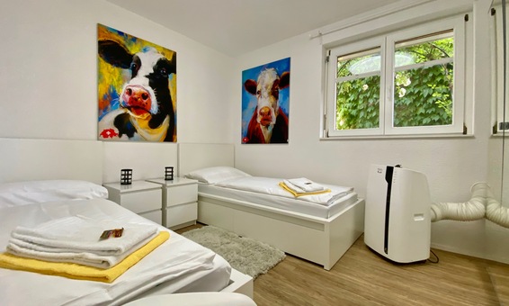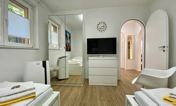 Schlafzimmer 2: Gemütliches Schlafzimmer mit 2 Einzelbetten, kl. Nachttisch I Leselampen I TV I Kleiderschrank I Kommode I Rolläden I Klima