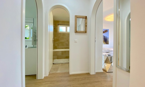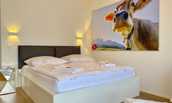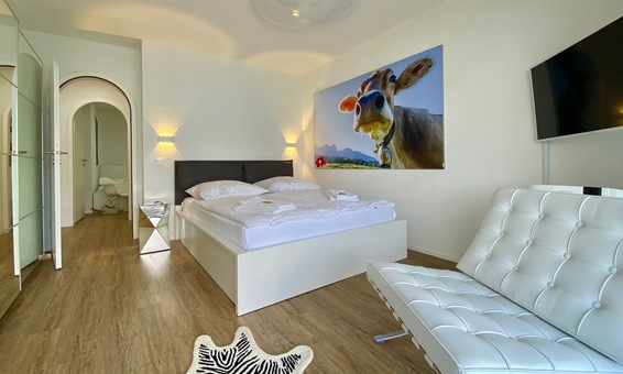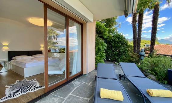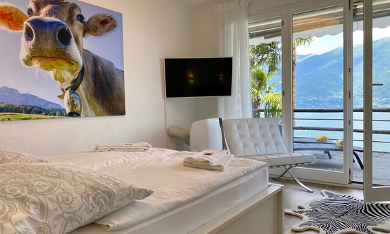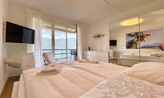 Schlafzimmer 1: Grosszügiges Schlafzimmer mit Doppelbett und Seesicht, kl.Nachttisch und Leselampen | grosser Kleiderschrank | Rolläden | direkter Zugang zur Terrasse I TV I Klima