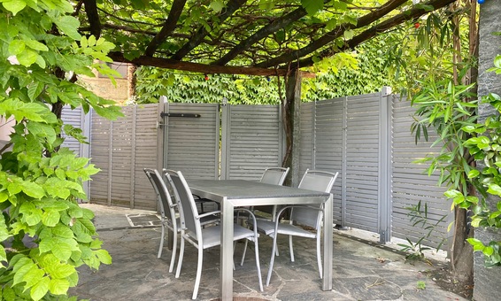 Aussenbereich: Grosszügige Terrasse mit 180° Seesicht und Sitzgarnitur (4 Personen) | 2 bequeme Liegebetten I Markisen | private geschützte Pergola mit separater Sitzgarnitur (4 Personen) I grosser Gemeinschaftspool im Garten (über einige Treppenstufen zu erreichen).