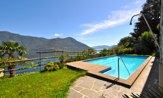Aussenbereich: Schöne Terrasse mit herrlicher Seesicht | Markisen | grosser Swimmingpool im Garten. Wir weisen darauf hin, dass die Gemeinde Brissago, bestimmt, wann die Pools gefüllt werden dürfen, was in der Regel ab Ende Mai - Anfang Juni der Fall ist.