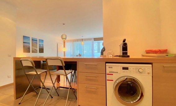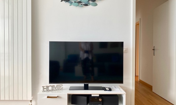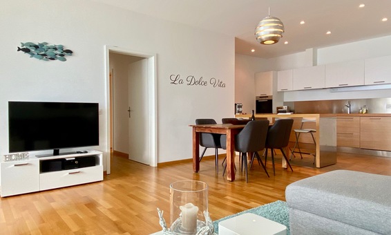 Sie betreten die 2,5 Zimmer Wohnung über einen Eingangsbereich mit Garderobe, es führen einige Stufen hinab in das ca. 40 cm. tiefer liegende Wohnzimmer. Der Wohnbereich ist hell und grosszügig gestaltet, mit grossen Schiebetür-Elementen die zur Terrasse führen. Im Wohnzimmer befinden sich eine Chaise-Lounge, sowie ein 4-Sitzer Sofa. Die moderne, offene Küche mit Bar ist mit allem ausgestattet, auch mit einer Nespresso-Kapselmaschine, und lässt keine Wünsche offen. Eine Waschmaschine ist ebenfalls in der Küche integriert. Ein Flatscreen TV mit internationalen und deutschsprachigen Programmen und W-Lan Internet (kostenlos) gehören ebenfalls zur Ausstattung. Die Ferienwohnung hat eine gesamt Wohnfläche von ca. 70 qm, und befindet sich in einer sehr gepflegten Residenz am Seeufer und Jachthafen von Ascona.