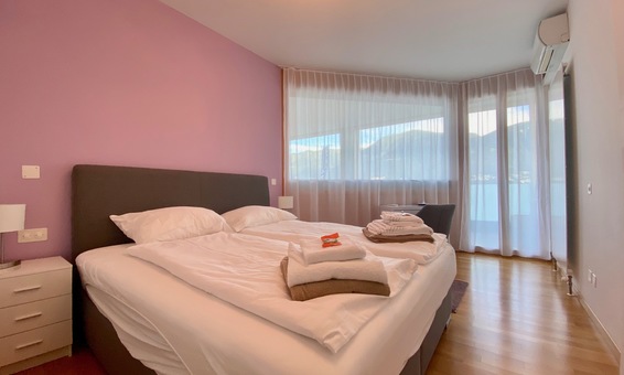 Es stehen 2 Terrassen zur Verfügung, eine vom Wohnbereich aus zu erreichen, die andere vom Schlafzimmer. Auf den beiden Terrassen finden Sie einen schönen Sitzbereich mit Tisch und 4 bequemen Stühlen, sowie 2 Liegen. Die Aussicht auf den See, Jachthafen, und die Berge ist einmalig schön. Auf den beiden Terrassen zum See geniessen Sie ganztägig Sonne.