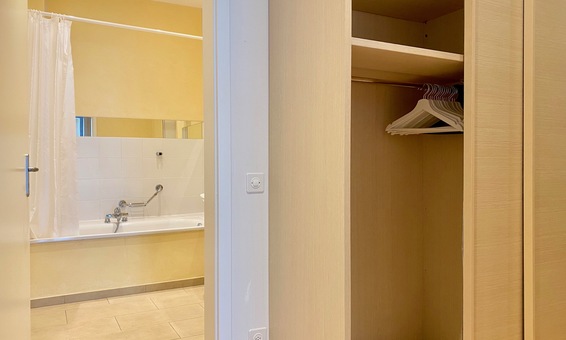 Das Wohnzimmer ist mit einem 4-Sitzer Sofa und einer Ottomane ausgestattet. Flatscreen TV und Internet. Zugang zur Terrasse. Schlafzimmer-Badezimmer: Das Schlafzimmer ist mit einem Doppelbett ausgestattet und bietet ebenfalls Zugang zu einer der beiden Terrassen. Im Gang vom Schlafzimmer zum Bad befindet sich eine grosse Garderobe mit mehreren Kleiderschränken. Das Badezimmer ist mit Badewanne-Dusche, Waschtisch und WC ausgestattet.