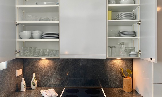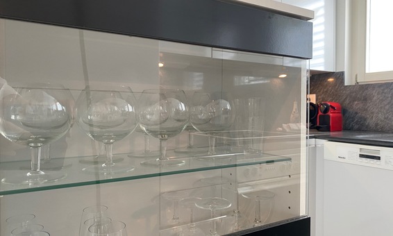 Die moderne Küche ist komplett ausgestattet und bietet nebst allen notwenigen Geräten auch eine Nespresso-Kapselmaschine, Wasserkocher, Toaster etc.