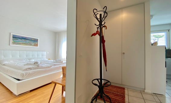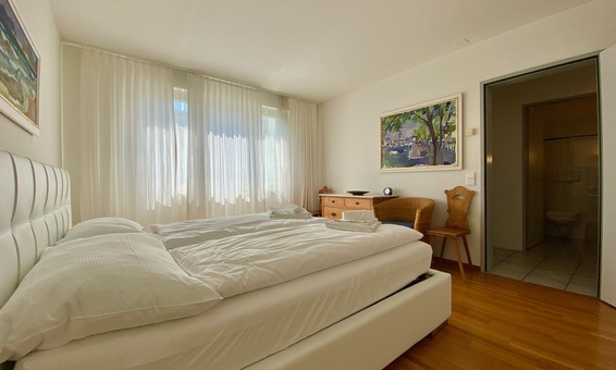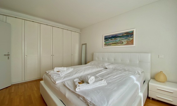 Das Schlafzimmer verfügt über ein Doppelbett mit hochwertigen Matratzen, zwei Nachttischchen, einen grossen Kleiderschrank sowie eine Kommode.