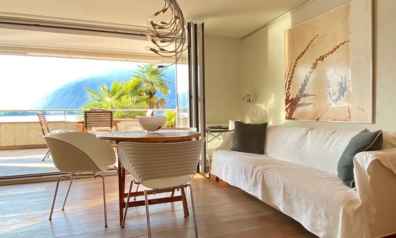 Grosse Fensterfront mit faltbaren Glastüren und direktem Zugang auf die grosse überdachte Terrasse mit herrlichster Seesicht.