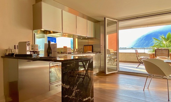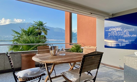 Die ca. 25 m2 grosse Terrasse im Wohnbereich bietet herrliche Sicht auf den See. Sie ist ausgestattet mit einem Gartentisch und 4 Stühlen. Zum gemütlichen Relaxen stehen 2 Liegestühle zur Verfügung.