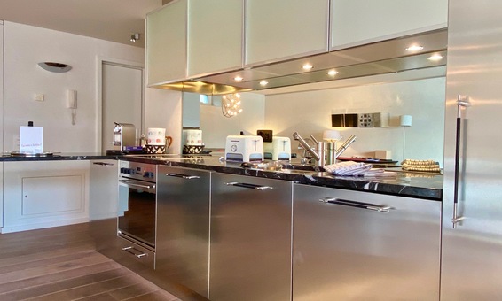 Wohn-Essbereich-Küche: 2 gemütliche Sofas, Bibliothek, Arbeitsplatz mit WLAN, Esstisch mit 3 Stühlen. Die offene moderne Küche ist bestens in den Raum integriert und komplett ausgestattet mit Ceran-Kochfeld, Backofen, Kühlschrank mit Gefrierfach, Geschirrspüler, Nespresso-Kapselmaschine, Wasserkocher, Toaster, Geschirr, Besteck und Gläsern etc.