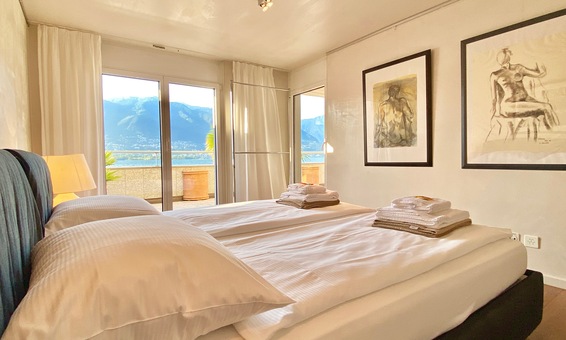 Schlafzimmer: King-Size Doppelbett, 2 Nachtische, grosser Kleiderschrank und Fensterfront mit direktem Zugang zur Terrasse.