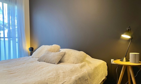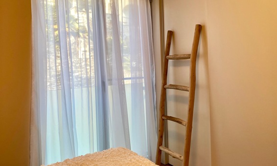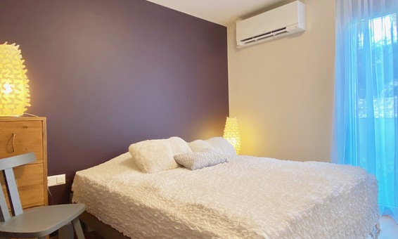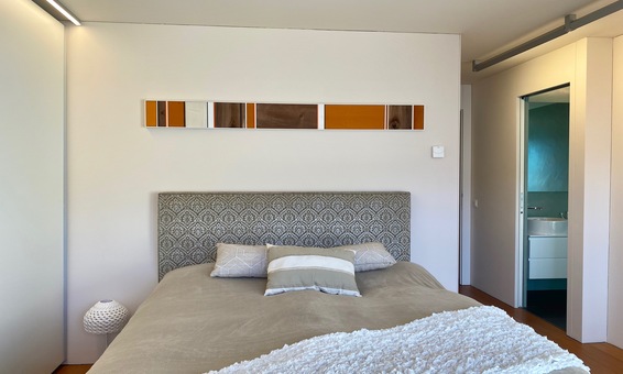 Schlafzimmer 1: Doppelbett I Bodenlampe I Einbauschrank I En-suite Bad I Ausgang zum kleinen Balkon mit Seesicht