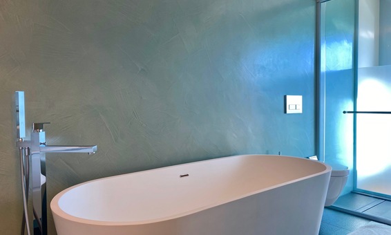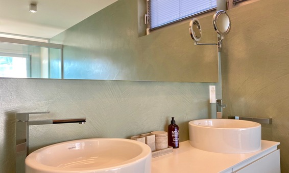 Badezimmer 2 (En-suite Bad): WC I Doppellavabo I Waschtisch mit Ablagemöglichkeiten I freistehende Designerwanne I Dusche mit Seesicht