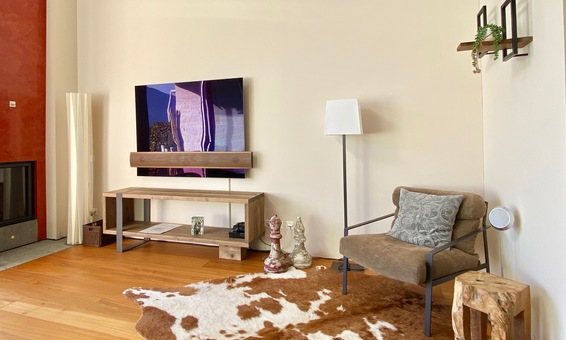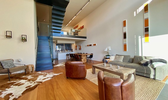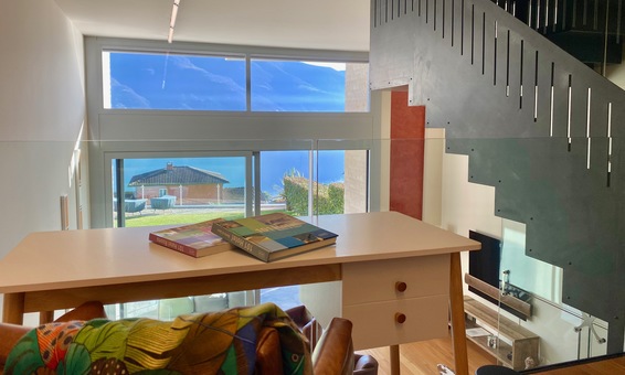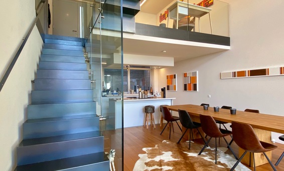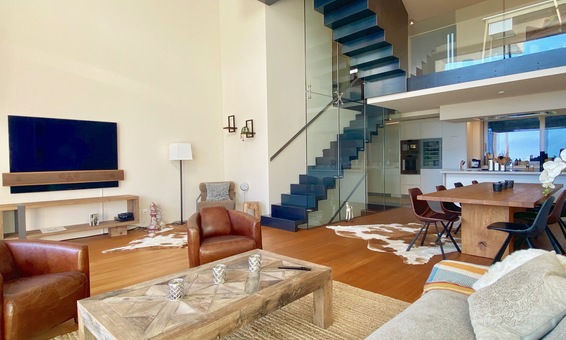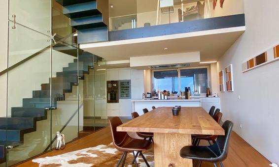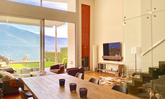 Wohn-Esszimmer: offener Raum im Loftstil mit grosser Fensterfront und Zugang zum Garten und auf die geschützte Terrasse mit fantastischer Seesicht I Sitzlandschaft I 2 Ledersessel I Beistelltisch I Sideboard I B & O Grossbildschirm-TV I Grosser Esstich mit 8 Stühlen I Kamin