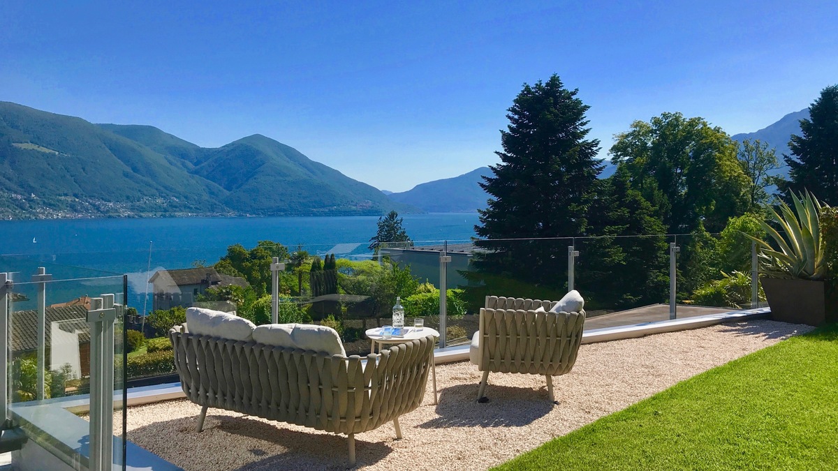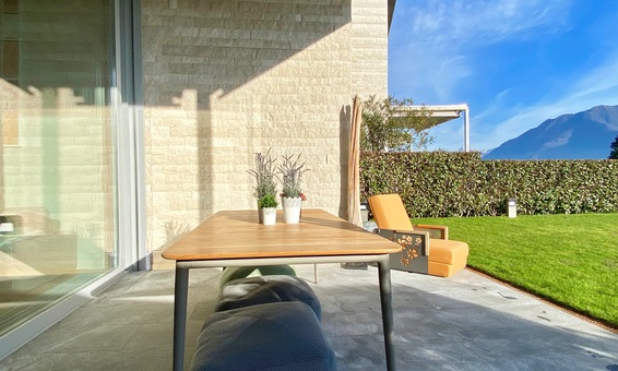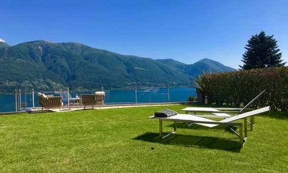 Aussenbereich: gedeckter Sitzplatz I Rasenfläche I Gartenmöbel (Tisch mit Stühlen, Sonnenliegen, Loungemöbel) - alles was es braucht, um herrlich zu entspannen und die fantastiche Seesicht zu geniessen