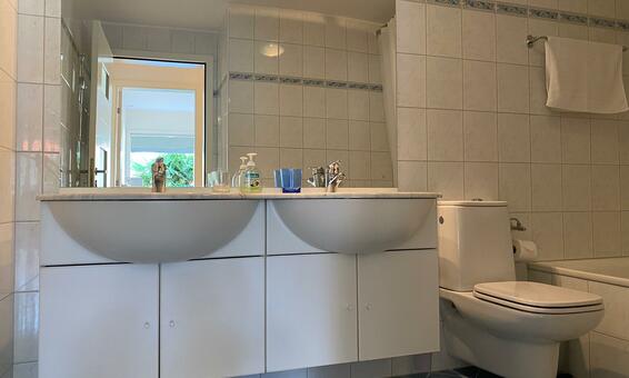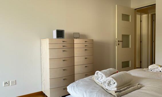 Das Schlafzimmer mit Ausgang auf den Balkon verfügt über ein Doppelbett mit Nachttischen und einen Kleiderschrank. Gleich daneben befindet sich das Badezimmer mit Wanne/Duschstange und Doppel-Waschtisch, in dem auch Platz für Ihre persönlichen Dinge vorhanden ist.