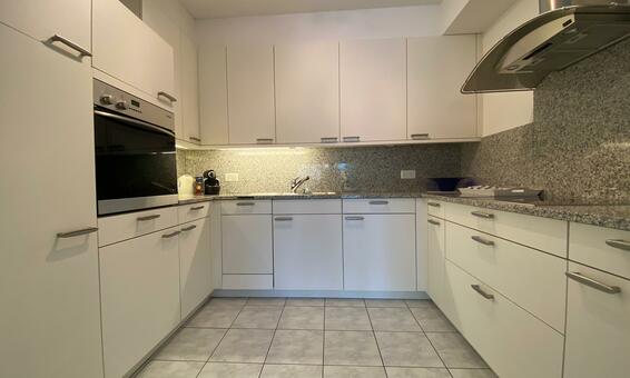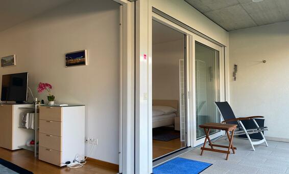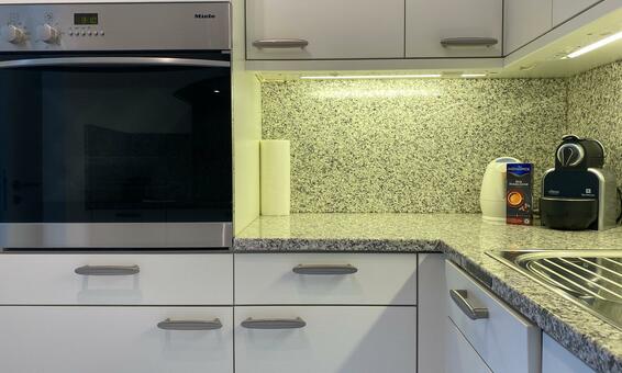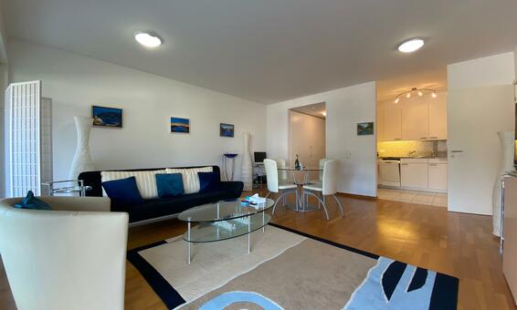 Von der Tiefgarage führt ein Lift zur Wohnung, die im 1. Obergeschoss liegt. Sie betreten die 2,5 Zimmer Wohnung über den Eingagnsbereich mit Wandschränken. Der Wohnbereich ist hell und grosszügig gestaltet, mit grossen Schiebetüren die zum Balkon führen. Das Wohn-Esszimmer ist ausgestattet mit einer Couch, Lesesessel sowie einem Esstisch mit 4 Stühlen. Die moderne Küche ist komplett ausgestattet, inkl. einer Nespresso-Kapselmaschine sowie Wasserkocher.