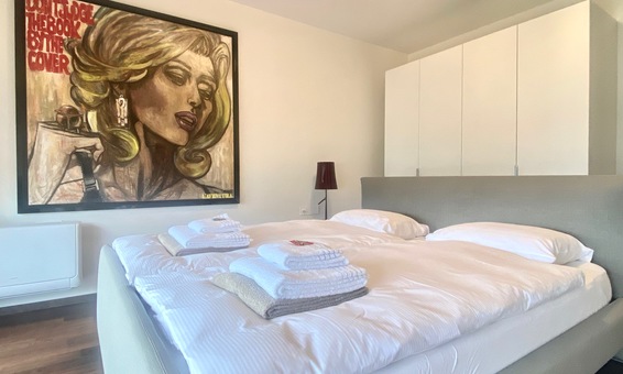 Schlafzimmer 1: King-Size Bett (180 x 200cm), grosser Wandschrank, Seesicht mit Ausgang zur Terrasse.