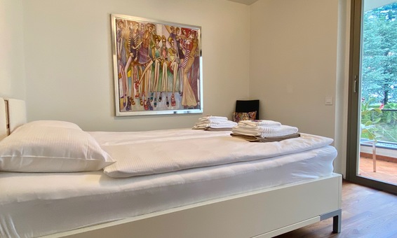 Schlafzimmer 2: Doppelbett (160 x 200cm), Garderobe, zugang zur Terasse mit Blick ins Grüne.