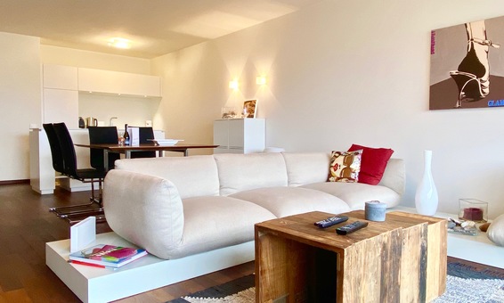 Wohnbereich: Wohn-Esszimmer mit Zugang zur Terrasse, Moderne Sitzlandschaft, Esstisch mit 4 Stühlen, TV, Internet, Gratis W-Lan.