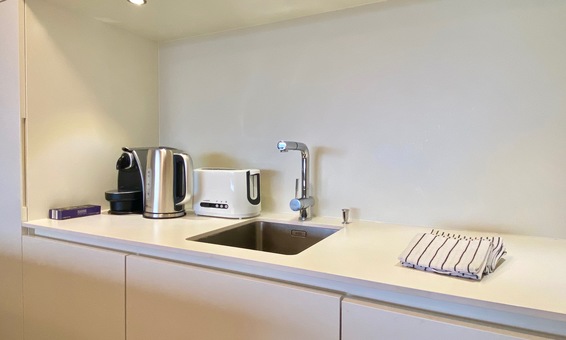 Küche: Voll ausgestattet mit Geschirr, Besteck, Gläsern, Töpfe und Pfannen, etc., Ceran-Kochfeld, Backofen, Geschirrspüler, Kühlschrank mit Gefrierfach, Wasserkocher, Toaster, Nespresso-Kapselmaschine (kleine Kapseln).