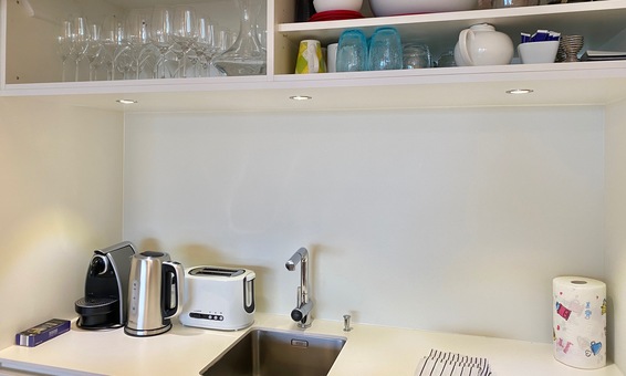 Küche: Ceran/Keramikkochfeld, Kaffeemaschine, Toaster, Gefrierfach, Besteck, Geschirrspülmaschine, Geschirr, Backofen