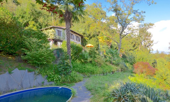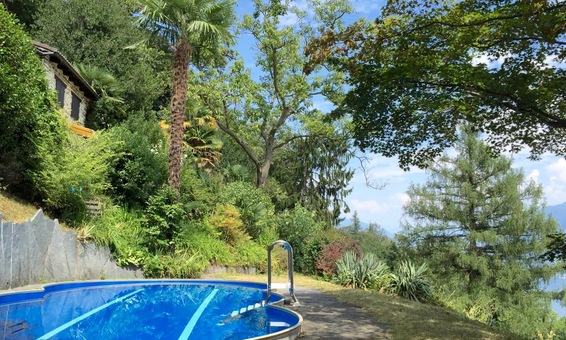 An erhöhter sonniger Lage, absolut ruhig und abseits von Strassenlärm in einer kleinen Privatstrasse gelegen, erreicht man dieses einzigartige Ferienhaus mit grossem Pool im Tessin direkt mit dem Fahrzeug über ein paar wenige Stufen.
