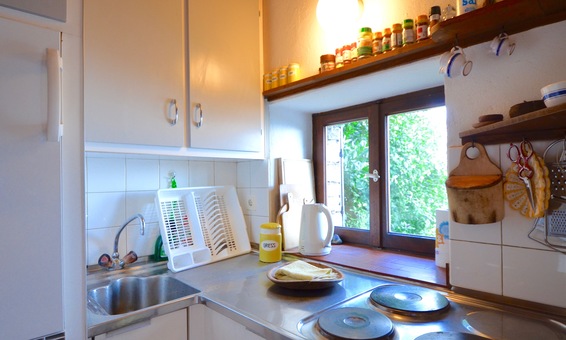 Küche mit Kühlschrank, Gefrierfach, Elektroherd ( 3-Platten traditionell) und Backofen. Die Küche ist komplett ausgestattet mit allen Utensilien, Geschirr, Gläser etc.